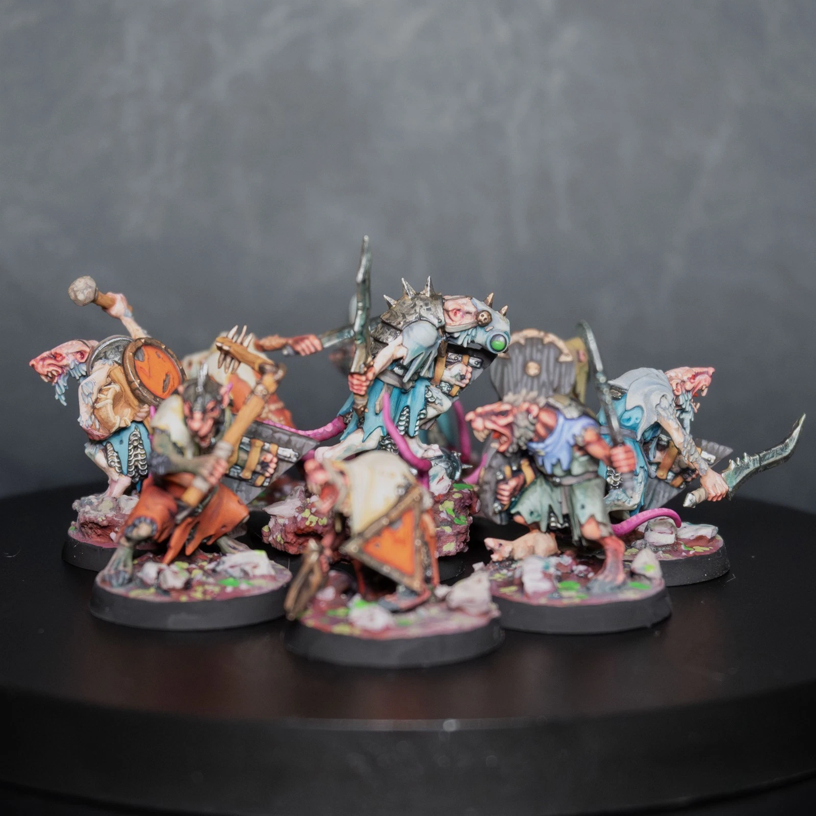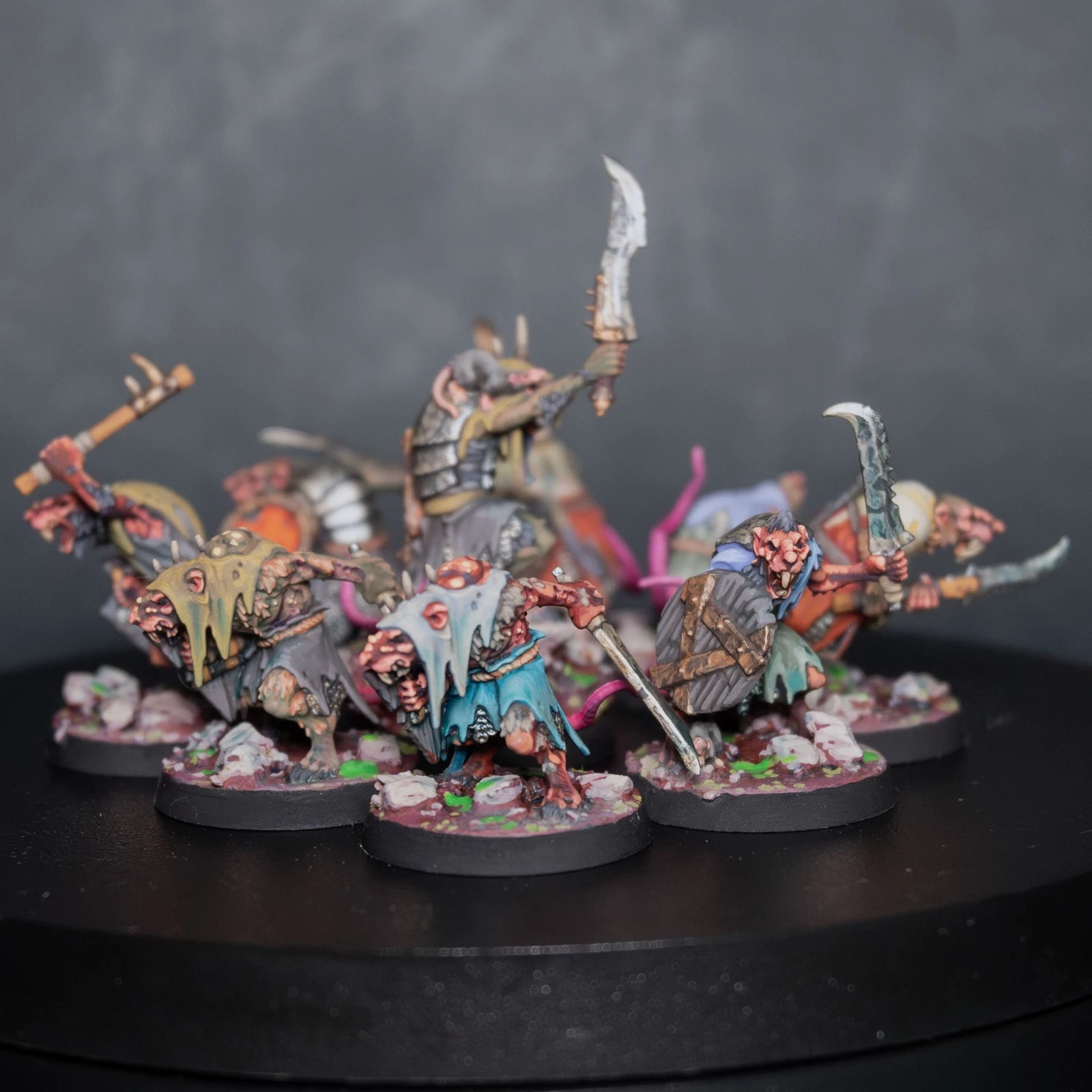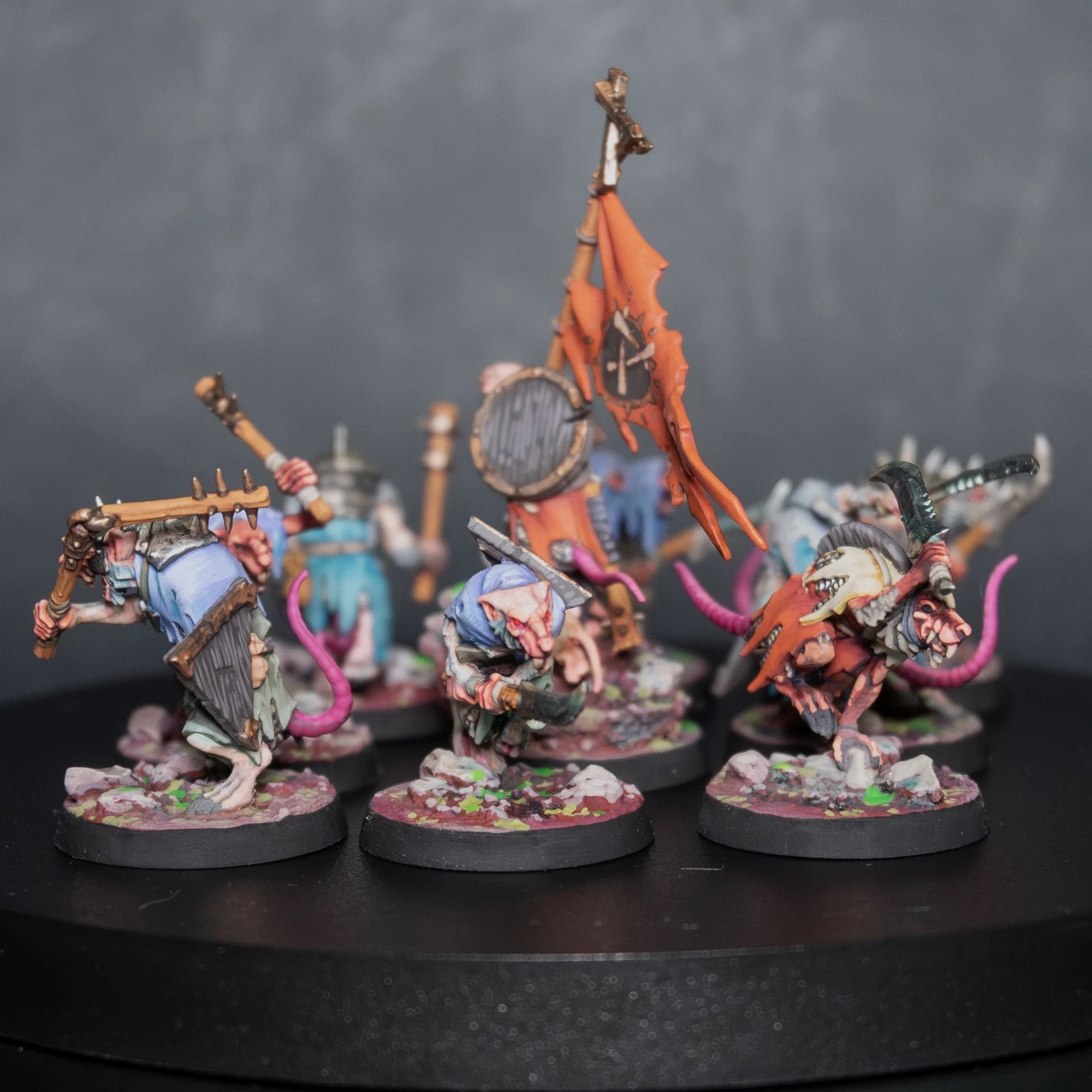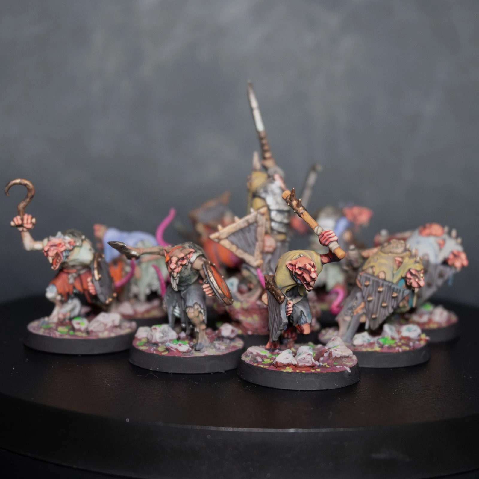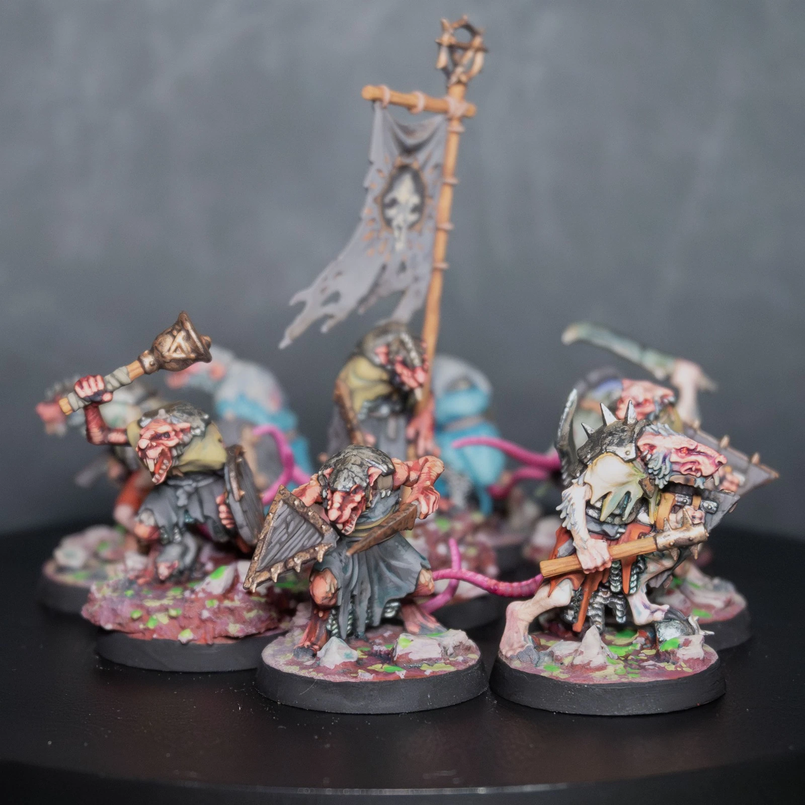 Una vera marea di roditori. 40 Clanrats dipinti con uno schema coerente e sporco, pronti a sopraffare ogni nemico nel nome del Grande Ratto Cornuto.