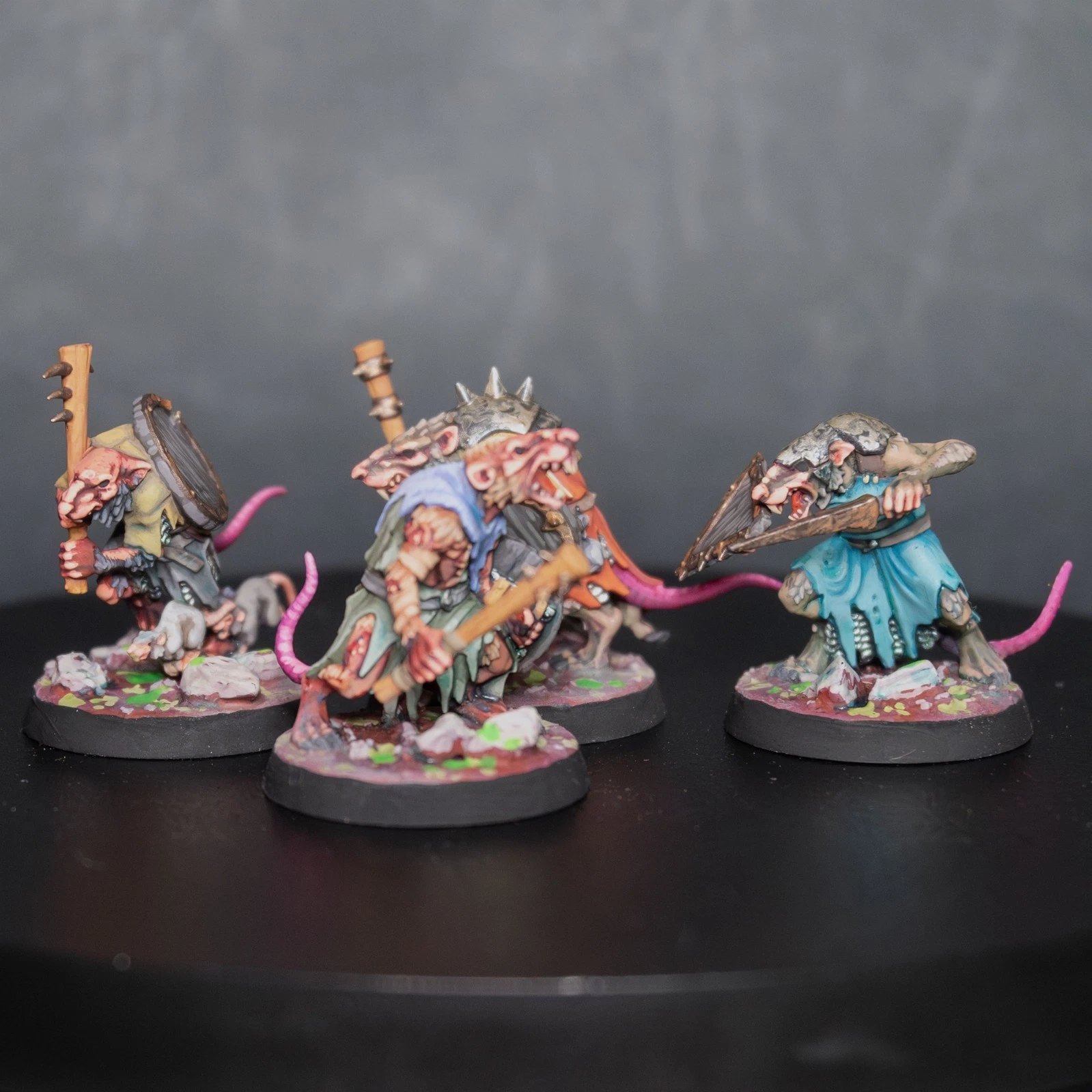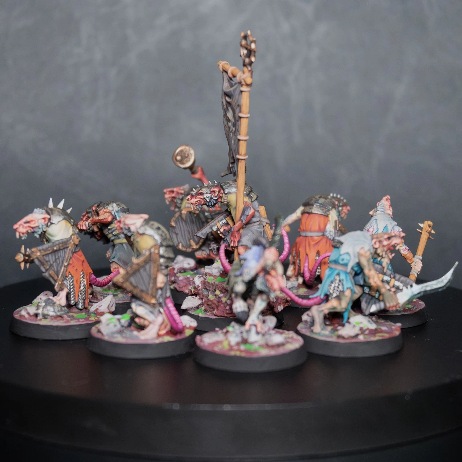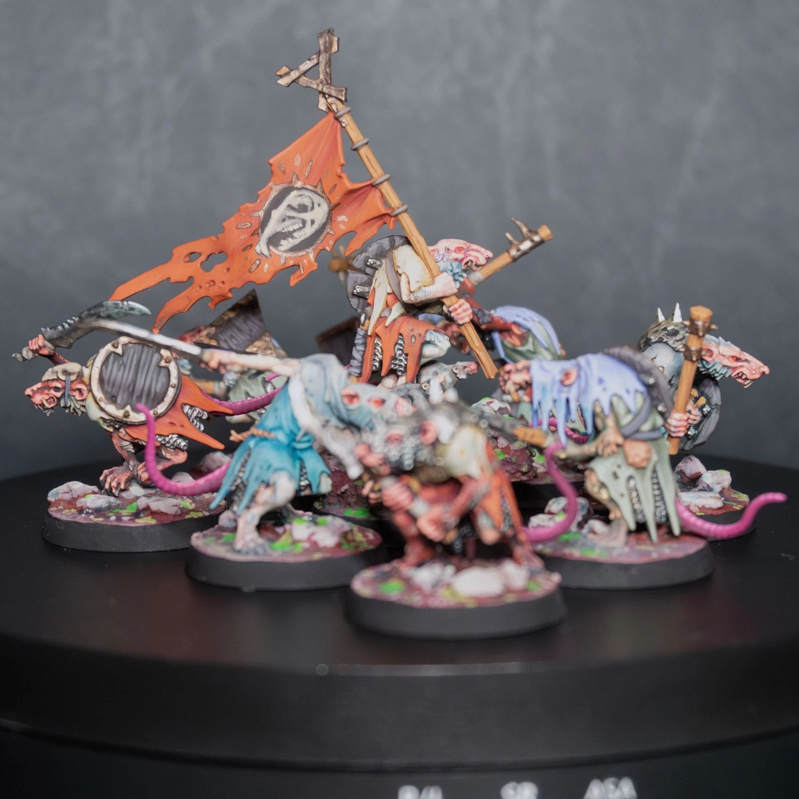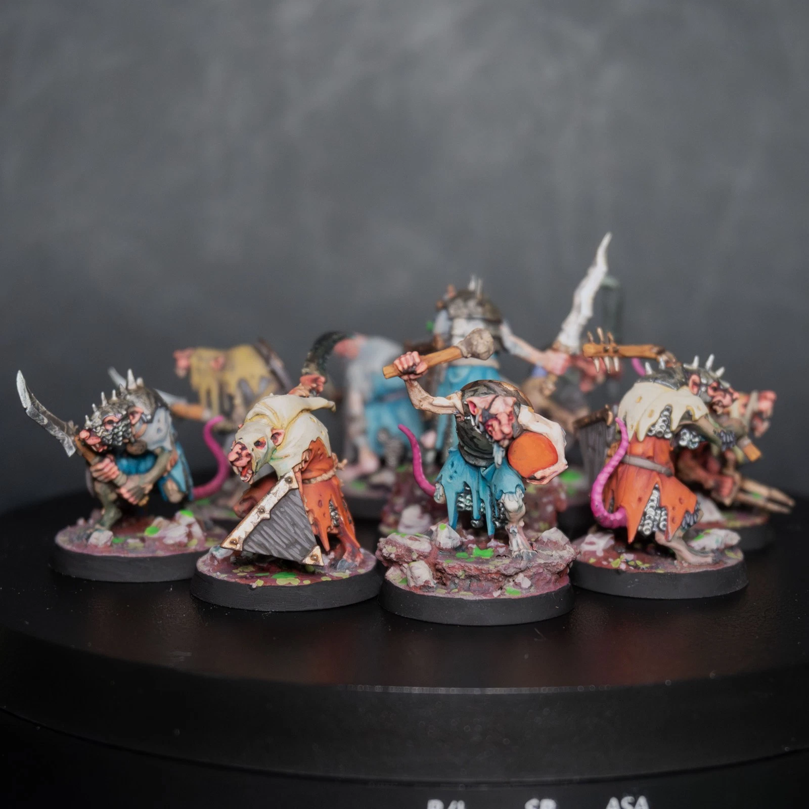 Una vera marea di roditori. 40 Clanrats dipinti con uno schema coerente e sporco, pronti a sopraffare ogni nemico nel nome del Grande Ratto Cornuto.