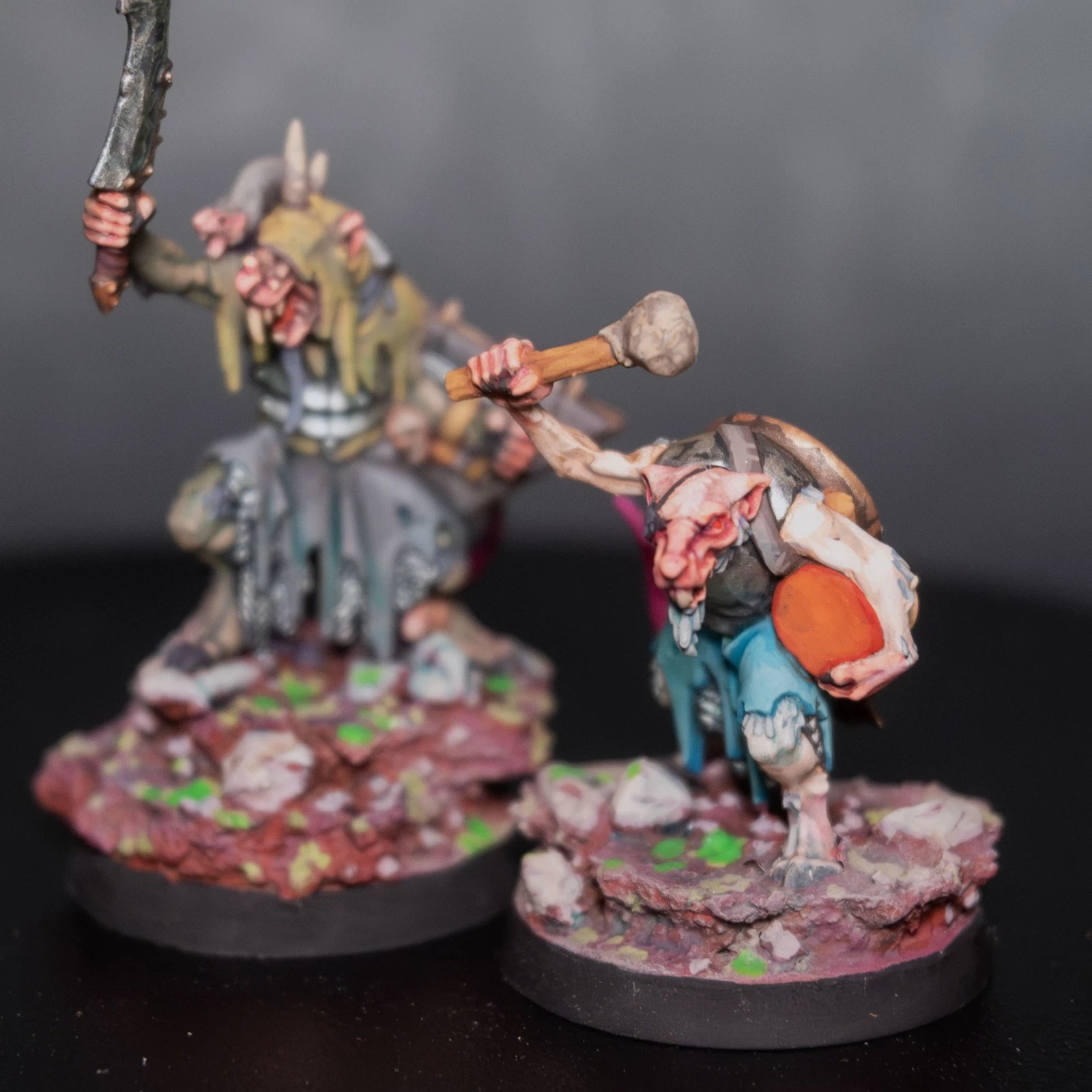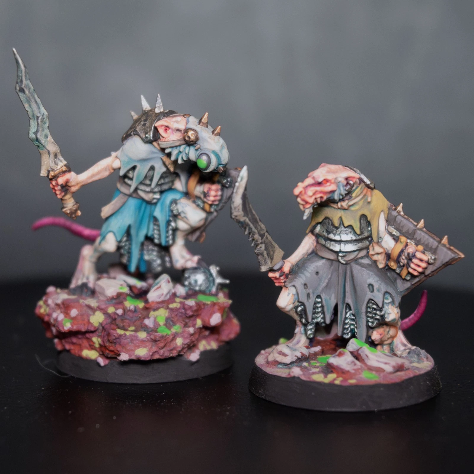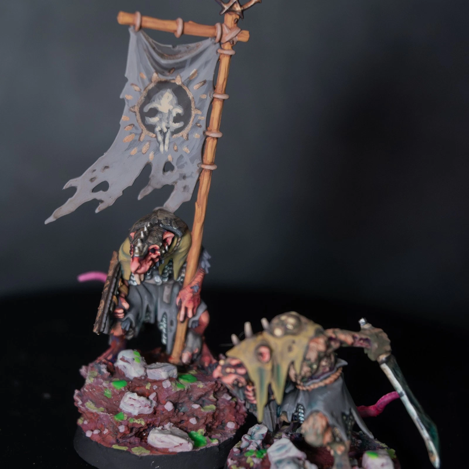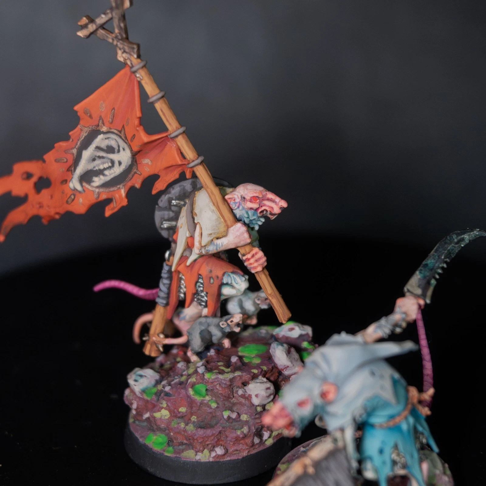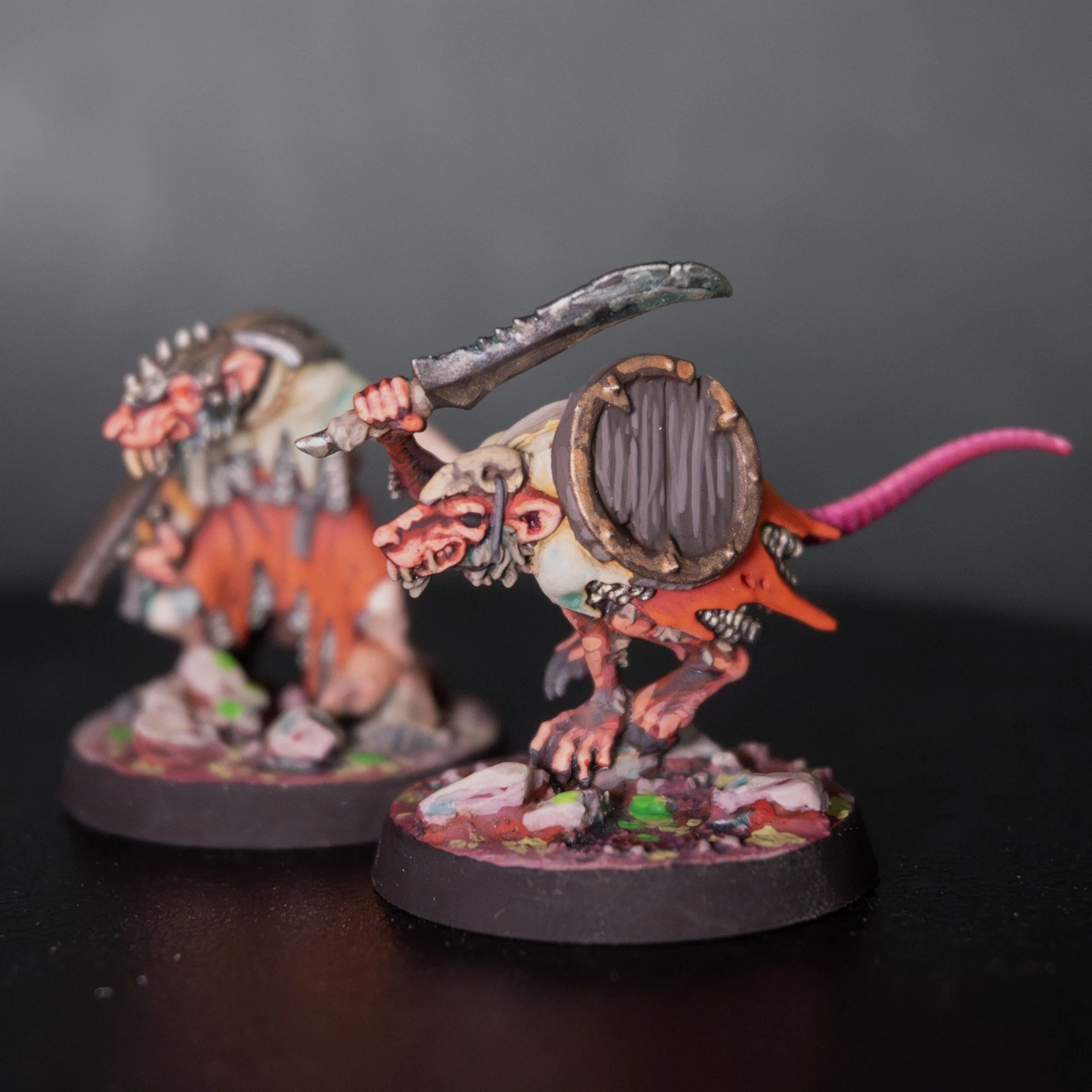 Una vera marea di roditori. 40 Clanrats dipinti con uno schema coerente e sporco, pronti a sopraffare ogni nemico nel nome del Grande Ratto Cornuto.